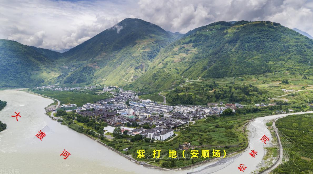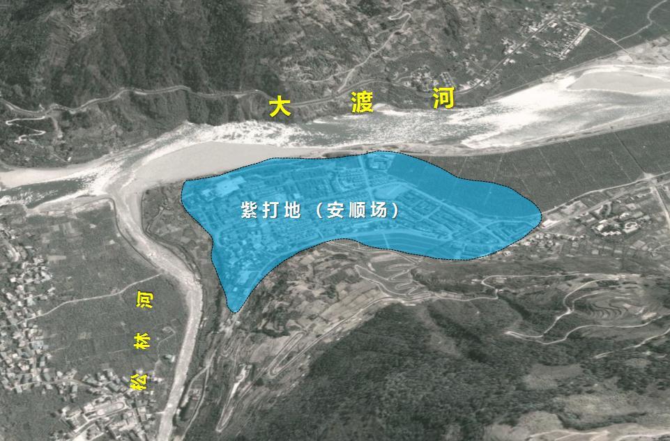 大渡河与松林河相交汇,围起了一块平坦的三角形地带。在这里,北边有大渡河,西边有松林河,再加上背后的青山掩映,使这里形成了一个封闭的地理空间,被称为“紫打地”,后来也被称为“安顺场”。