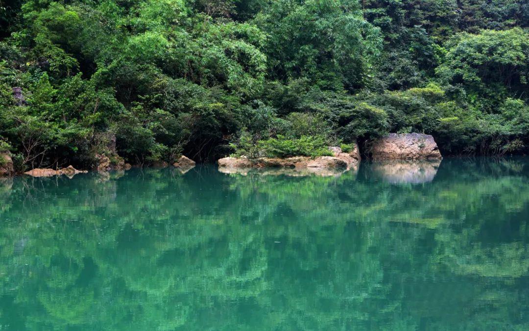 河水清澈透明,翠竹相拥
