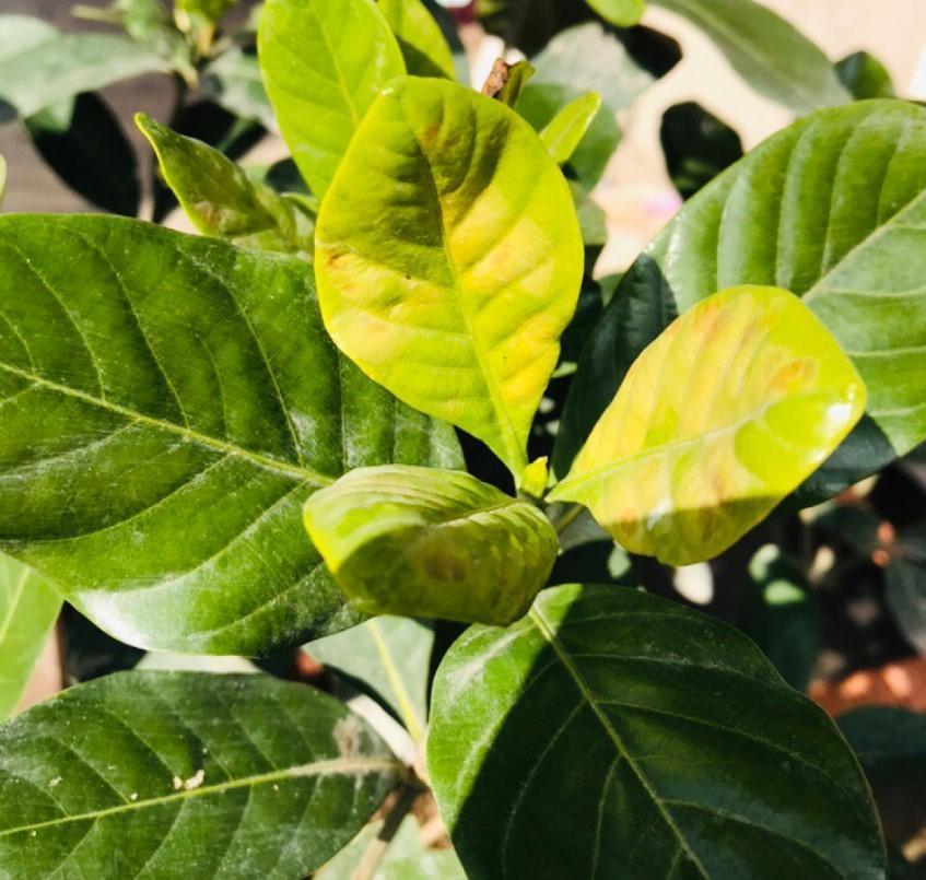 像这棵栀子花,黄叶就是因为气温不合适,温度太高了,影响了铁元素的吸收。