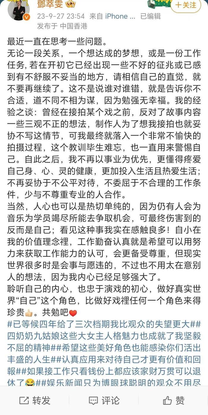 不在名单之中的邓萃雯发了一篇长文,但真正想说的可能都在标签里: