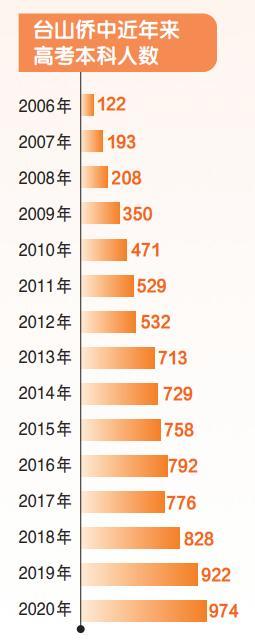 近十余年来,台山侨中稳步提高,最终实现跨越式发展,2020年,台山侨中高考本科上线人数974人,其中马潮业同学被北京大学经济学院录取,成为台山侨中42年来又一个考上北大的学生。