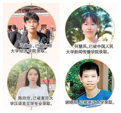 在今年的高考中,台山侨中又创辉煌:本科上线974人,比去年增加52人,刷新历史纪录,其中文科本科上线341人,理科上线345人,体艺双线上本科286人。文化科尖子生成绩突出,优分上线人数与去年相比增幅达26%。其中,马潮业同学已被北京大学经济学院录取,陈欣欣同学已被上海复旦大学录取,何慧凤同学已被中国人民大学录取,谢晓阳同学已被浙江大学录取。