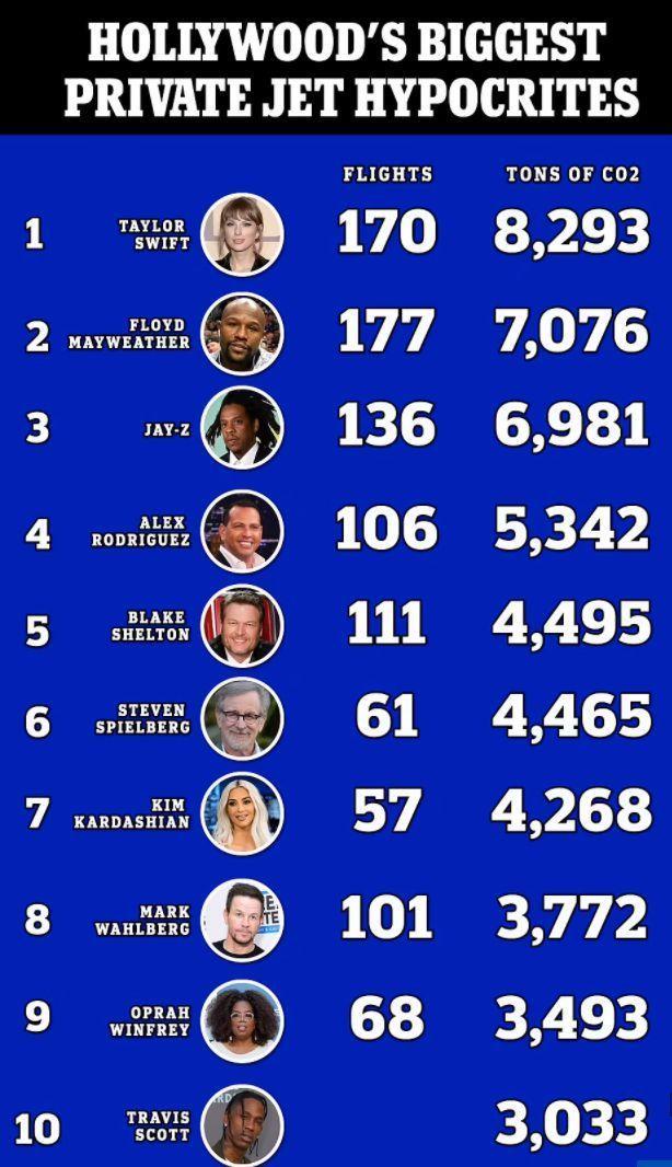 在明星私人飞机使用频率榜单上,金小妹连前10名都挤不进去,而占据第一位的竟然是霉霉。