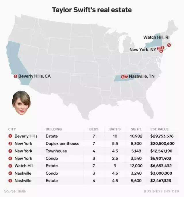 她在纽约一共有3处房产,都在Trubeca(翠贝卡)大厦,因此霉霉又被称为Taubeca(霉贝卡)