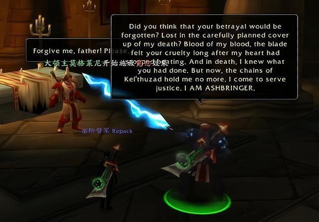 看到了么?当你装备上了未被净化的灰烬使者,本来跟你处于敌对状态的血色十字军成员就会马上跟你变成友善关系。据上古老玩家回忆,香草时代如果你带的是堕落的灰烬使者即这把剑没有被净化之前,你需要完成一个任务才会出现上图这种情况,但不知道为什么,后面某个版本暴雪修改了这一设定,直接改成了剑没有被净化之前就可以让佩戴者化身成为灰烬使者。不知道马上开放的P6版本是否会沿用修改后的设定,应当是没有了的,否则净化后的堕落的灰烬使者属于传说品质的双手剑,但是目前没有任何渠道可以查询到这把神器,说明永久绝版了。