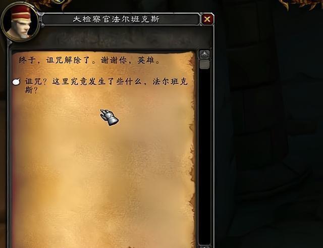 具体的故事很漫长,我来给大家总结一下。据法尔班克斯的讲述,现任血色十字军指挥官莫格莱尼背叛并亲手杀死了他的父亲老莫格莱尼,他为了追求力量投靠了巫妖王的副官克尔苏加德,真是一出不折不扣的悲剧!而老班克斯因为知道了小莫格莱尼的阴谋和所作所为才被下了诅咒,幸运的是邪不压正,我们拯救了他!