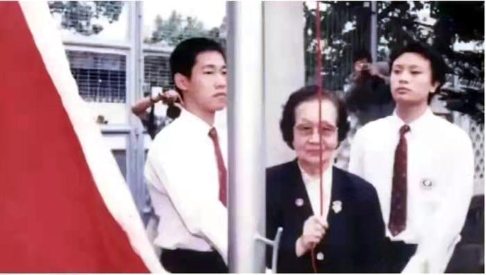 1999年12月20日,澳门回归祖国当天,已经87岁高龄的杜岚,放下拐杖亲自升起国旗,把对国家的爱传递给澳门濠江中学的孩子们。