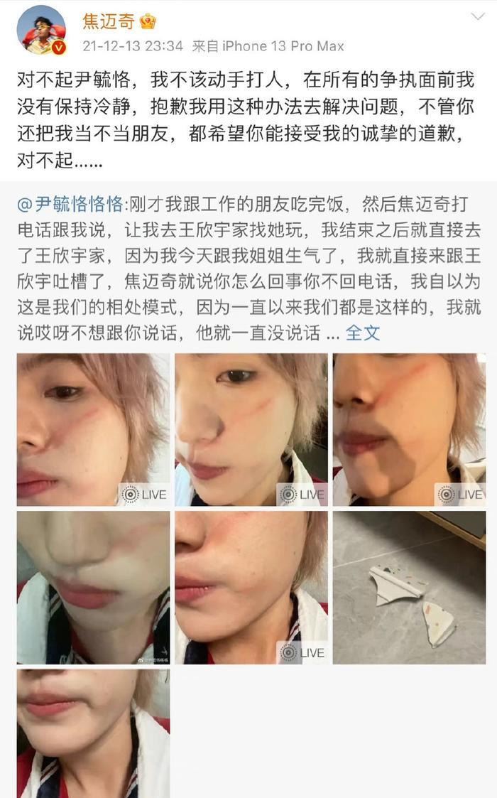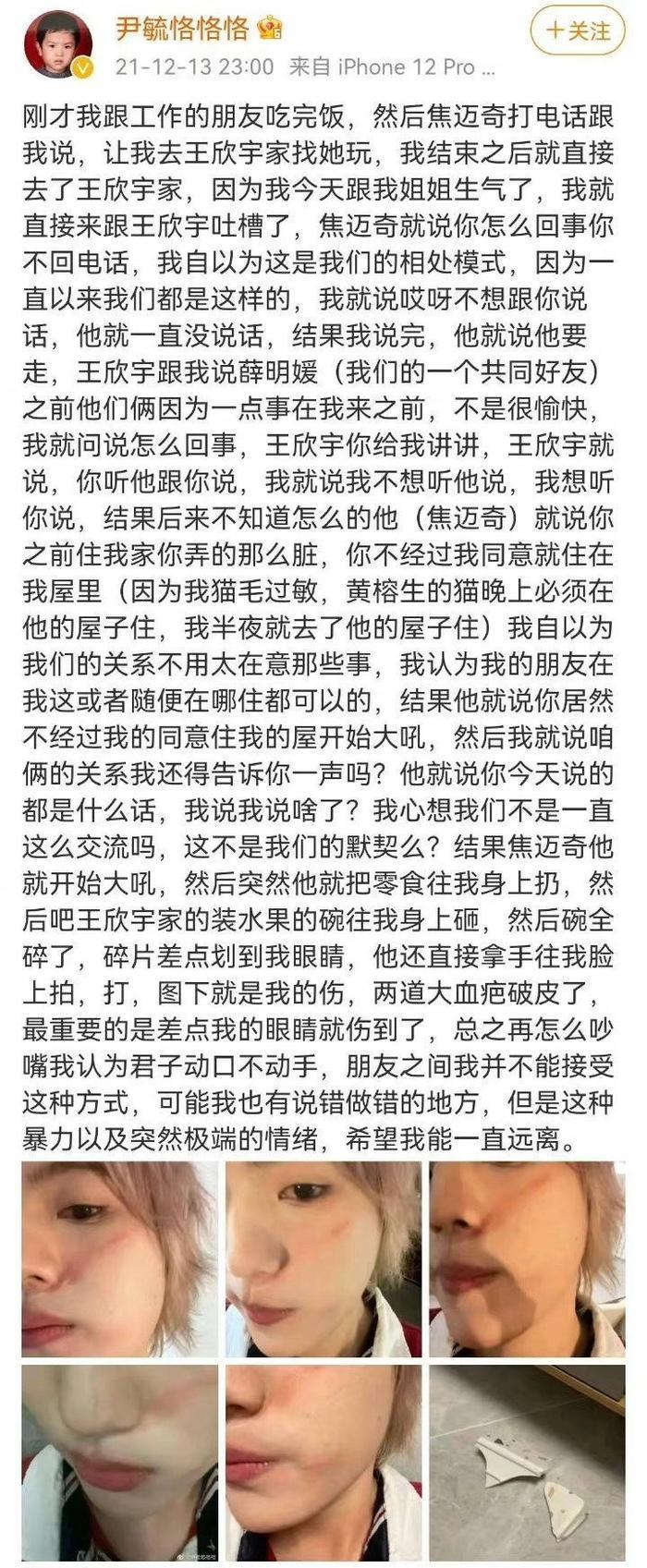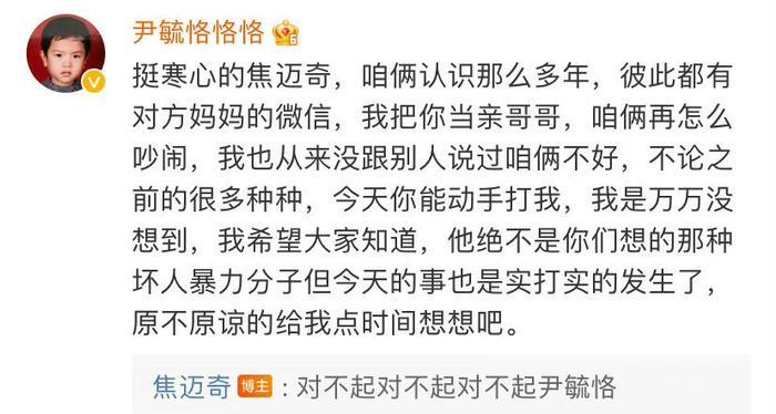 17年快男选手尹毓恪发长文控诉焦迈奇打了自己,原因是之前自己没经过焦迈奇同意住了他房间,但尹毓恪觉得俩人关系好到不用打招呼就能住