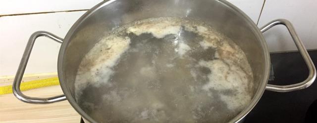 等到水煮开了以后,我们能够明显到看到锅的上面有一层泡沫,然后把锅里边的水倒掉,我们需要用水把鸡爪冲洗干净。