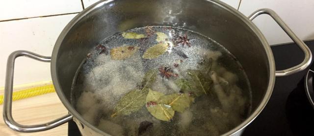 我们放入煮的香料,香叶5片,八角2~3个,姜片若干,盐适量,盐的量我们可以根据自己平常炖汤的来,也或者稍微多加上一些盐,等到水煮开了以后,我们再煮上7分钟的时间就可以关火了。