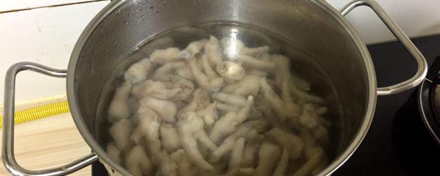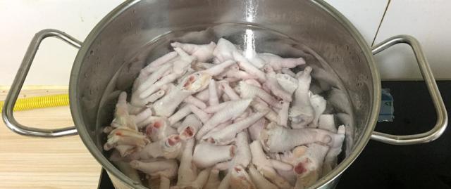 再把我们清洗干净的鸡爪重新放入到锅里边,再倒入干净的水。