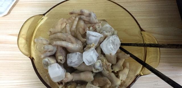 鸡爪冲洗干净了以后,一直等到没有油水为止,这里就存在用自来水冲,还是冷开水冲,还是冰水,那么根据自己的判断吧,可以加入适量的冰块让其再次降温,如果家里边没有冰块的话,也可以省略。