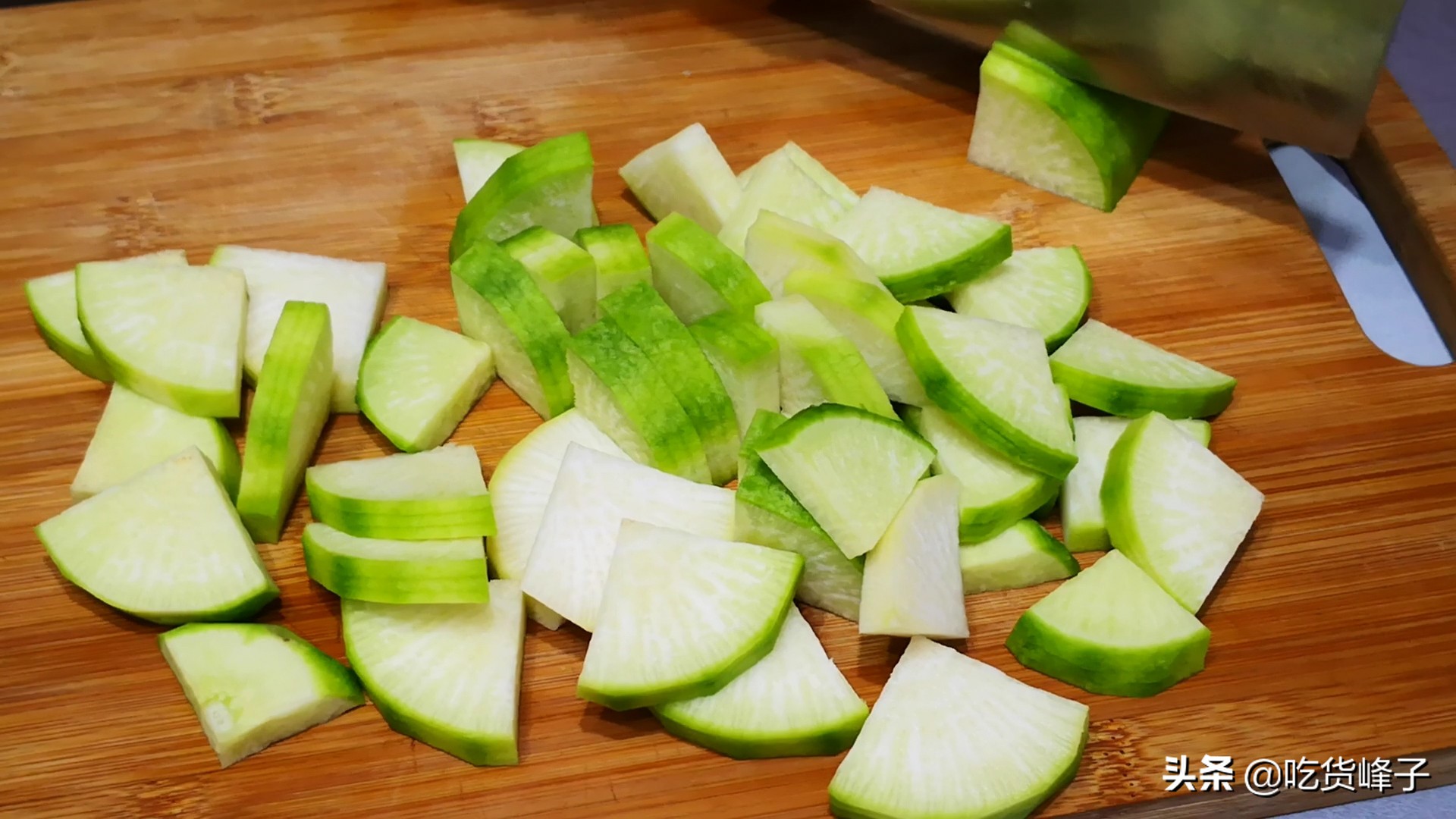 先把萝卜的头和尾部口感不好的地方用刀切掉,为了口感更好(萝卜皮辛辣味重),我把外皮也削掉了,然后竖着分成四块再切成连刀片,三片相连不要切断,这样切的萝卜片吃起来口感好。