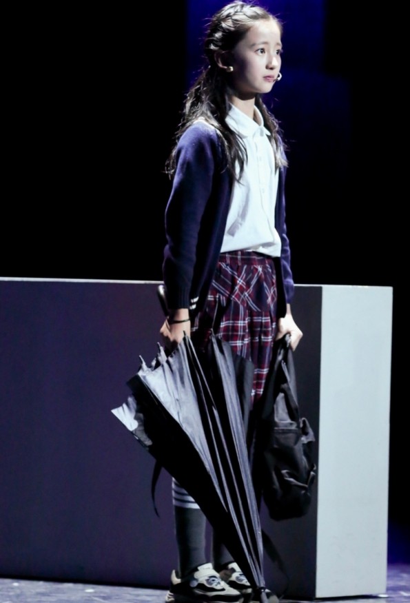 她身穿的这套穿搭很简单干净,上身穿了一件深蓝色的开衫外套,整洁干净的外套很清新,内搭白色的衬衫更是凸显了简约大方的气质,搭配一条格纹的半身裙,这样的搭配,9岁太成熟。