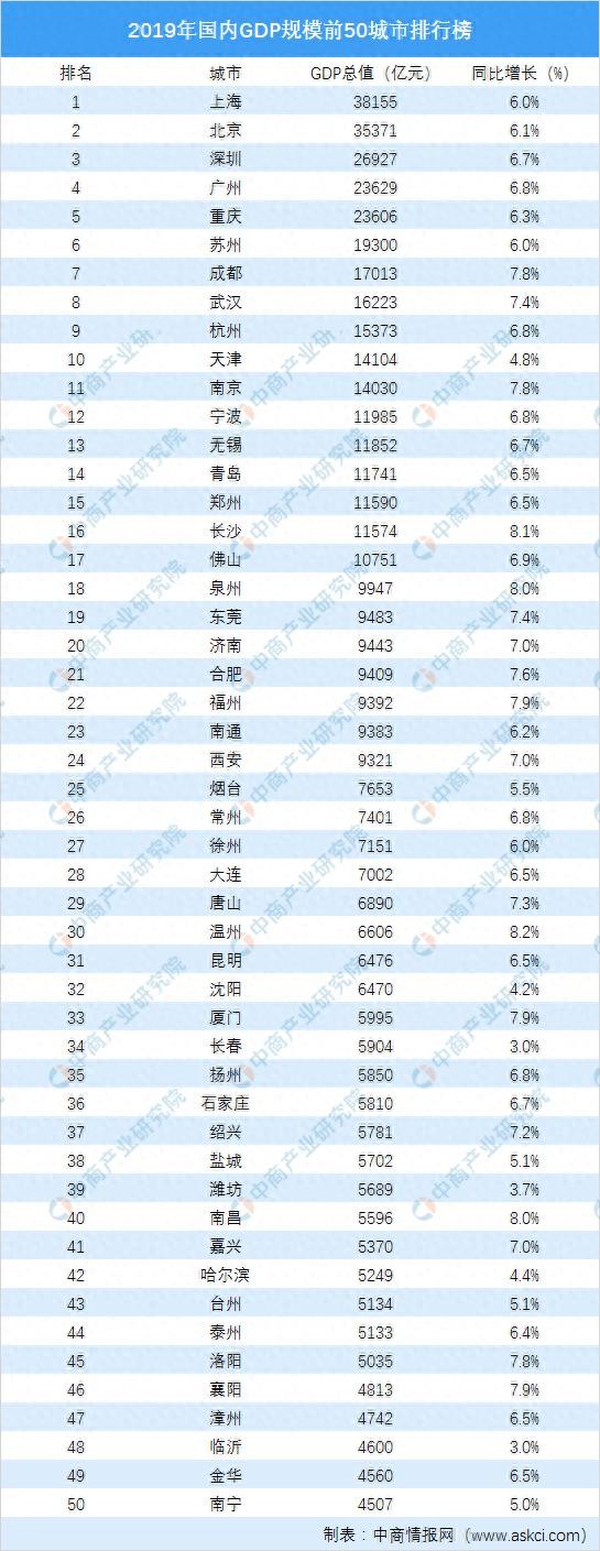 2019年全国GDP规模前50城市排行榜