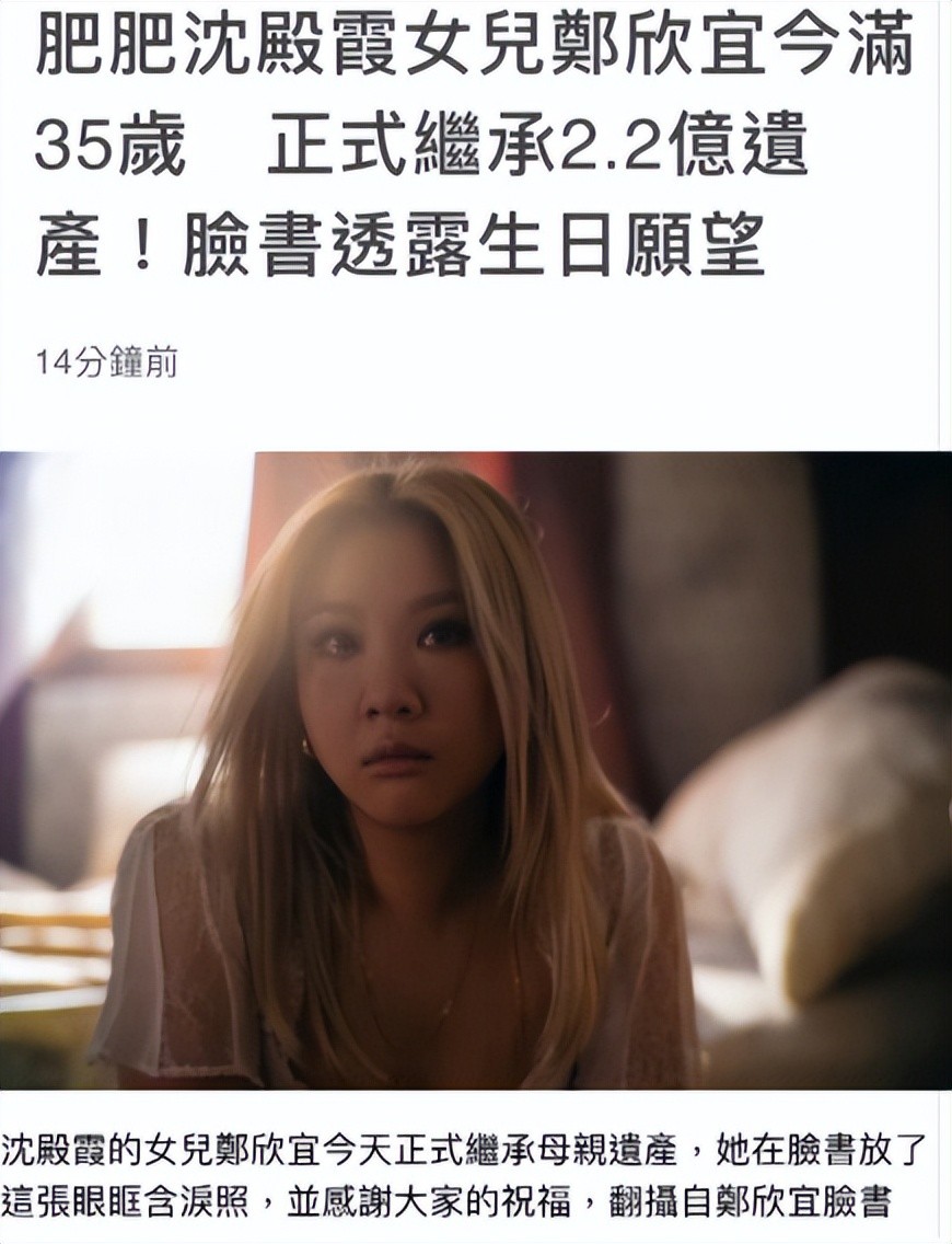 而今天是她35岁的生日,也是她将要继承母亲高额遗产的日子,当时沈殿霞写下的遗嘱表明,自己的女儿郑欣宜需年满35岁才能继承遗产,在此之前,每个月都可以从中领取2万元港币(约人民币1.7万)当生活费,而今天,就是可以继承遗产的时候,这也使她的身价再度飙升。