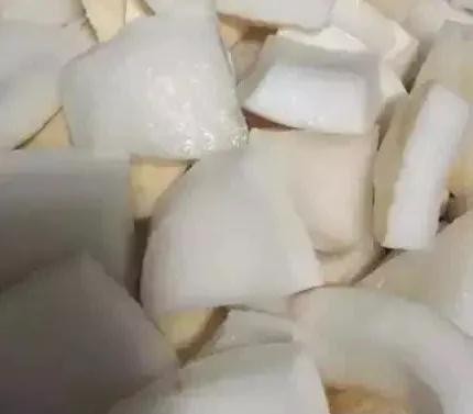 两只椰子开口倒出椰汁,再取出半个椰肉切条。在家自己不会动手的可以找卖椰子的老板帮忙处理好椰子。