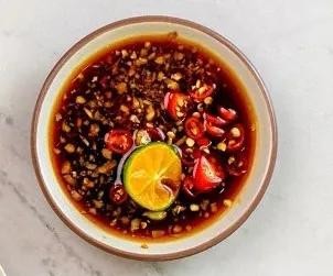 接下来来做蘸料,3小米辣切碎,一块沙姜切碎, 都放入碗里,倒5勺蒸鱼豉油挤入1个青柠檬汁,