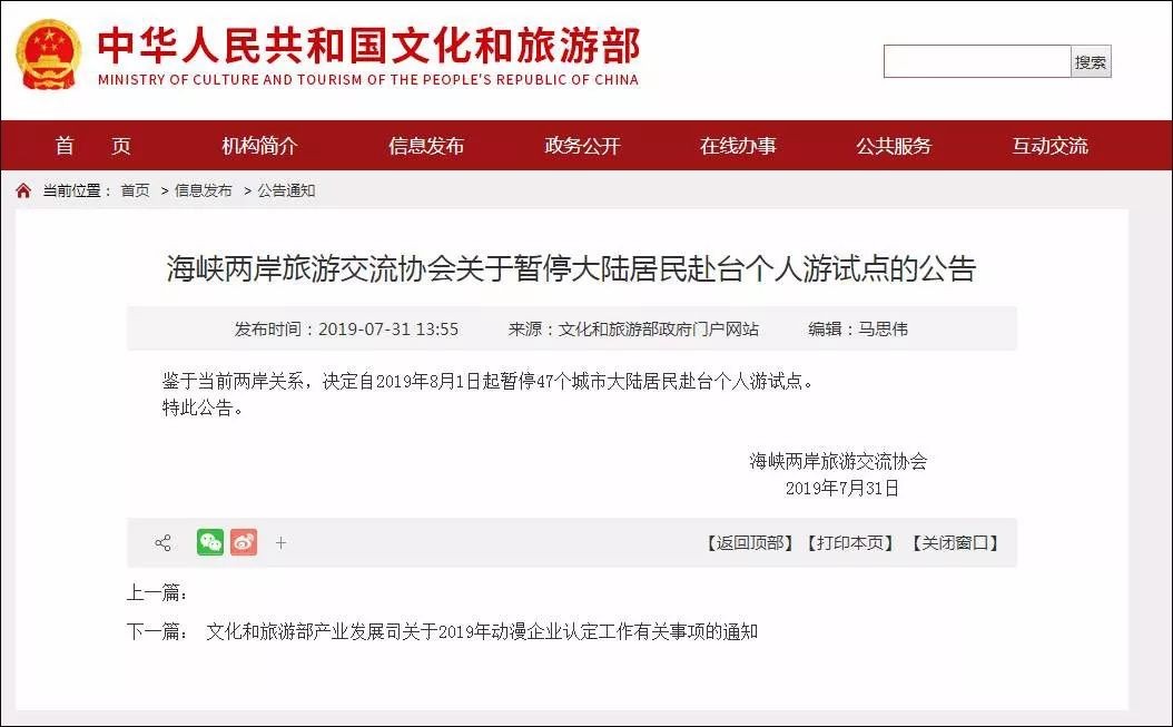 文化和旅游部31日在官网发布了《海峡两岸旅游交流协会关于暂停大陆居民赴台个人游试点的公告》,称决定自2019年8月1日起暂停47个城市大陆居民赴台个人游试点。