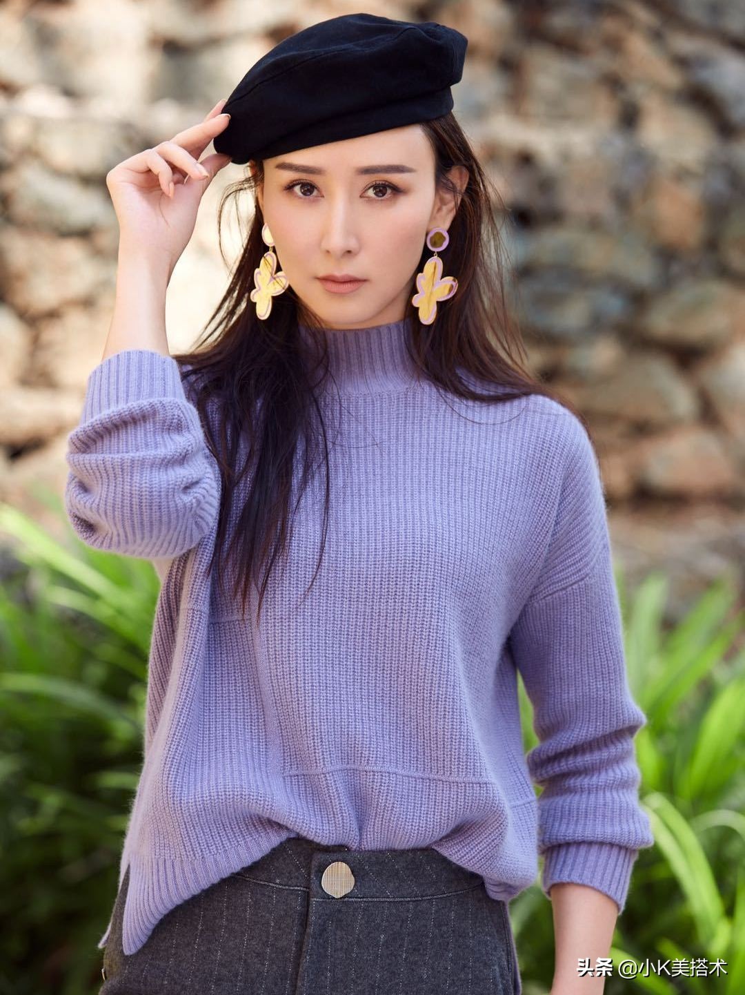 这一套造型的风格非常比较大,紫色毛衣搭配灰色长裤,舒适又休闲。黑色贝雷帽搭配个性的耳坠,潮流又时尚!这一套造型一改性感风格,换成了比较清新休闲的风格,看上去居然毫无违和感!