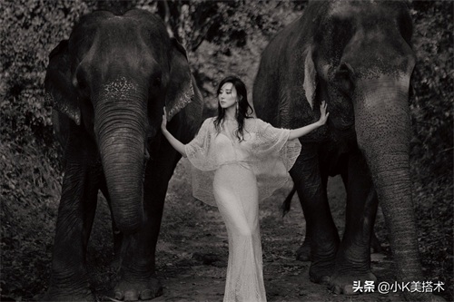 胡静身穿白色薄纱长裙,和大象亲密接触,画面十分高级,像极了电影里的场景!胡静湿发披肩,搭配薄纱的披肩和修身的白色长裙,十分性感迷人!胡静身形十分纤瘦,所以即使是修身的造型依旧驾驭得游刃有余!