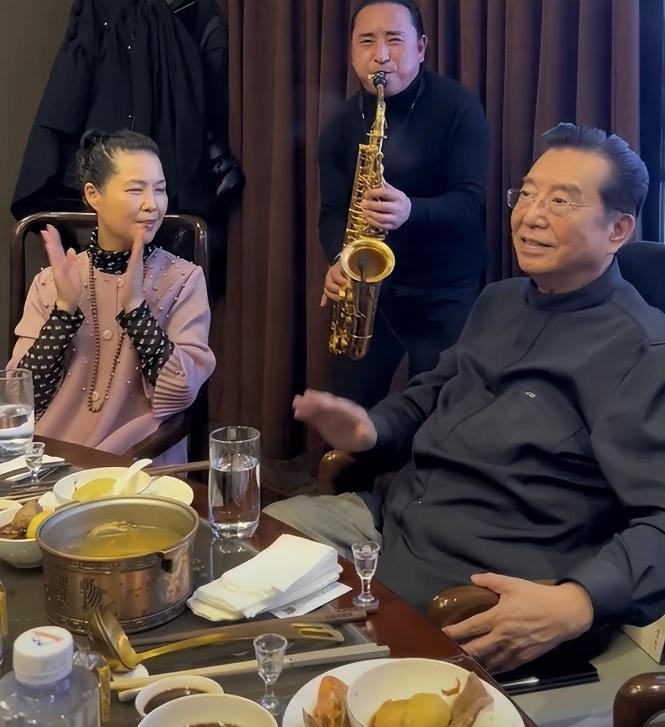 当天李双江穿着一身黑色的衣服,还专门染了黑色的头发,将自己收拾的板板正正,小27岁的妻子梦鸽,穿的也十分年轻,一边听着著名萨克斯表演家刘家军的表演,一边鼓掌享受着美妙的音乐,乐不思蜀,很是开心。