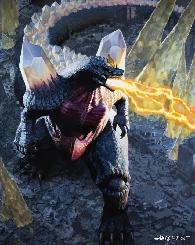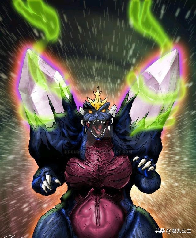 而且太空版哥斯拉的外表真的很恐怖,而且它嘴部长满了巨大的獠牙。其中最明显的特点,就是其背部和肩部有着巨大的水晶,身体的颜色与普通的哥斯拉有些差异。