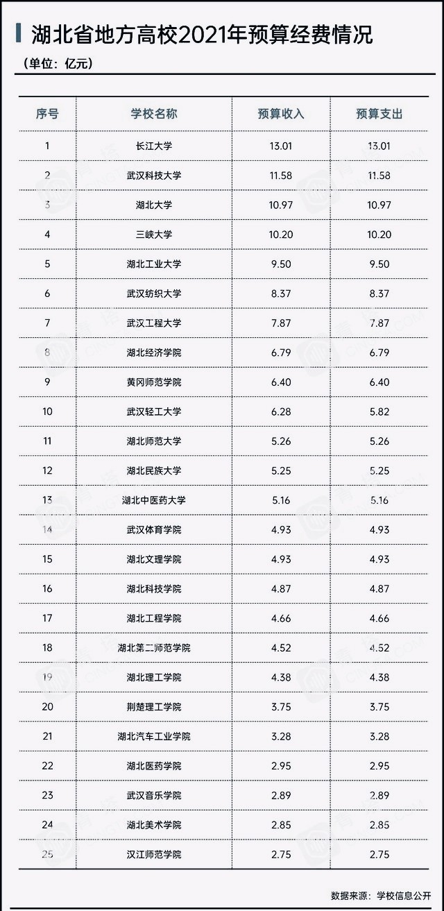 湖北省地方高校的预算经费也已经公示,三峡大学排在第四,也是省内地方高校经费预算超过10亿的四所大学之一。