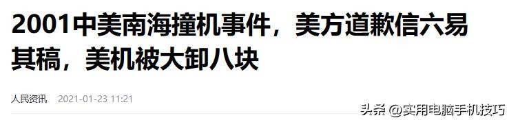 原文刊载于人民资讯2021-01-23关于“2001中美南海撞机事件,美方道歉信六易其稿,美机被大卸八块”