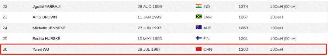 中国选手吴艳妮在这次排名中上升了12位,排在第26位,并创下个人和中国田径的新历史高位,首次进入前30名。另一位中国选手林雨薇则微升一位,排在第43名。20岁的夏思凝下滑5位,目前排名第181位。