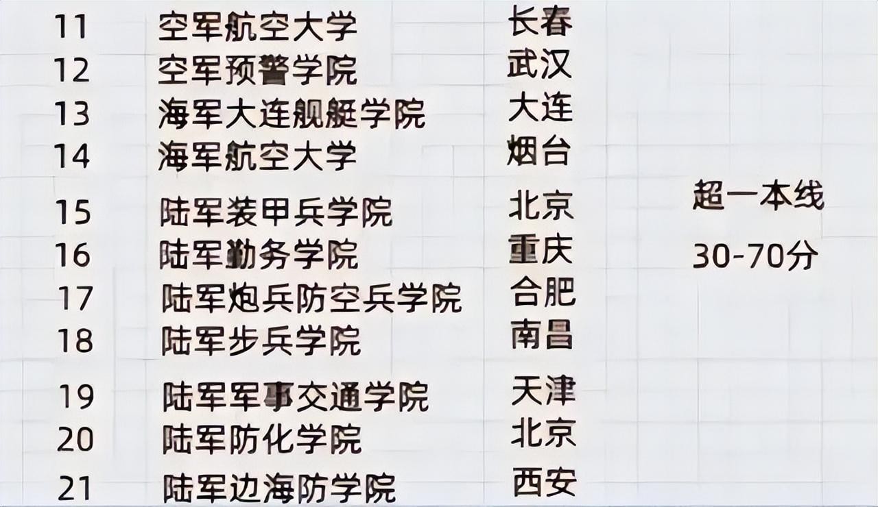 第三梯队:11所院校,比一本线高30-70分。这个级别的学校,已经开始让人感到压力山大了。东北的两所院校——空军航空大学和海军大连舰艇学院,光听名字就知道不好惹。