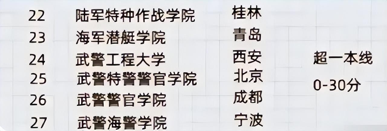 第四梯队:6所院校,比一本线高0-30分。这些学校,说实话,门槛算是最低的了。但别高兴太早,能上一本线的考生,哪个不是尖子生?况且,这里面有4所是武警院校,听着就够霸气的。