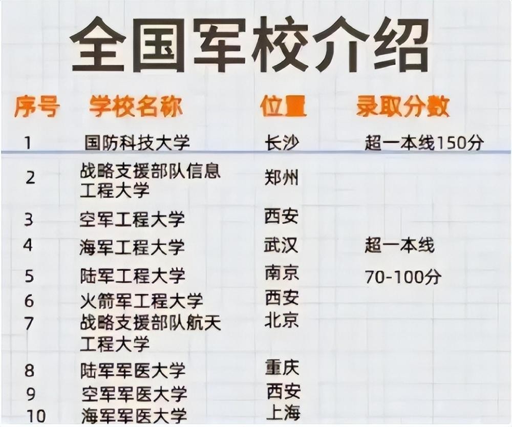 有关全国27所军校的最新排名出炉,这份榜单可谓是给不少考生和家长都上了一课。榜单显示,这些军校的录取分数线普遍比一本线高出一大截,有的甚至堪比顶尖985高校。尤其是被誉为“军中清华”的国防科技大学,更是让人望而生畏。