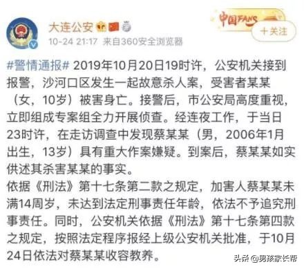 此次大连10岁女童案的凶手13岁,身高170cm,体重140斤,案发后越来越多的信息披露,该男孩多次尾随成年女性进楼道,意图不轨,可见其意图明确,具备成熟的作案思路。