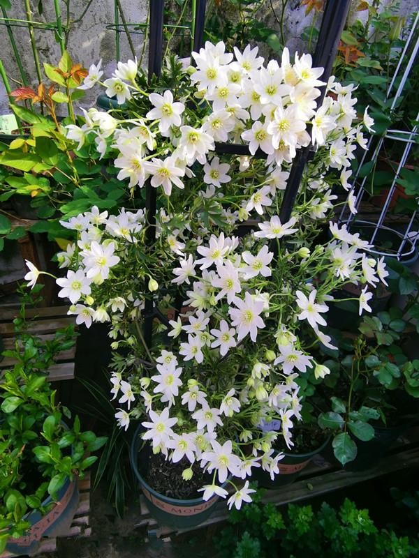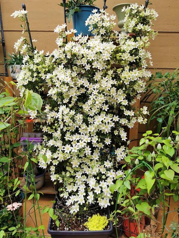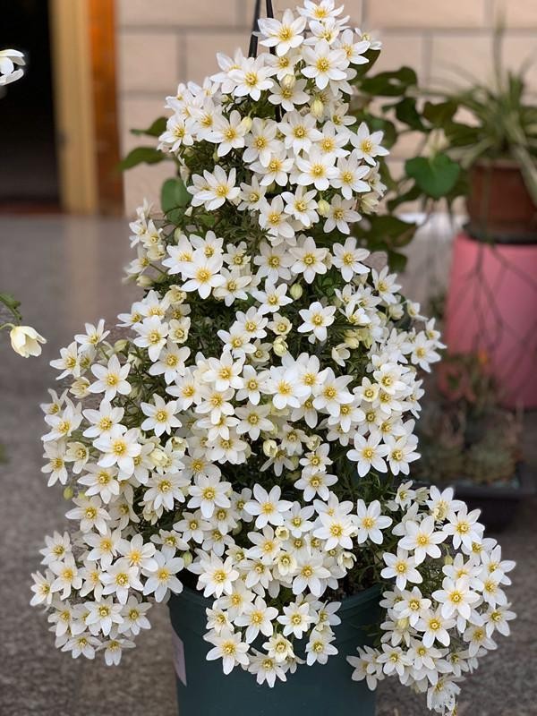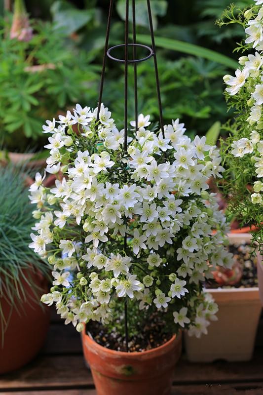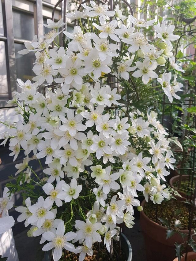 银币是经典的早花品种,往往是铁线莲里开花最早的一个,一般早春3月长花苞,3月底能盛放,花朵在盛开的同时,还会再长新的花苞,所以它陆陆续续能开到五六月份,养护得当,秋天还能开到一次,花朵虽然不大,但是胜在花量大,单次花期长,是公认的一款开花性极好的铁线莲,盛开之间,花朵熙熙攘攘,你挨我挤,只见花朵不见叶,非常壮观。