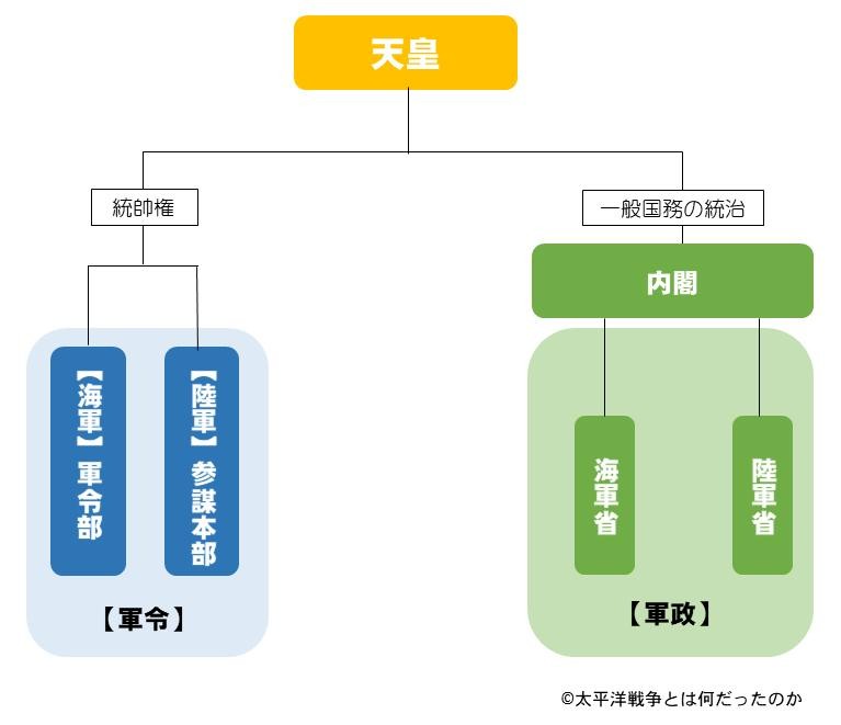 其中军令部首领,陆军叫“参谋总长”,海军叫“军令部总长”。军政首领,陆军叫“陆军大臣”,海军叫“海军大臣”。具体来说,就是参谋总长和军令部总长平时直接管理军队,但统一归日本天皇统帅。并且参谋总长和军令部总长直接归天皇管理,行政部的内阁(政府)没有权利插手作战和军队指挥等事务。如果总理大臣(首相),外务大臣(外交部长),陆军大臣和海军大臣等内阁成员对作战和指挥插手的话,参谋总长和军令部总长就以干涉“统帅权”的名义,对内阁成员进行反击。