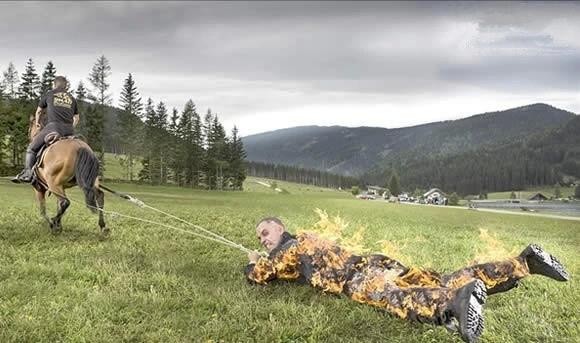 这个男子非常的大胆,在浑身着火的情况下,被马拖行了500米,获得了世界纪录。
