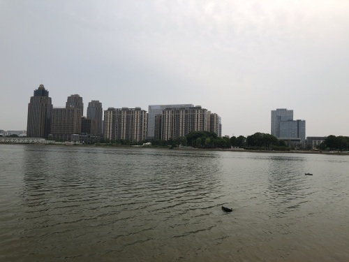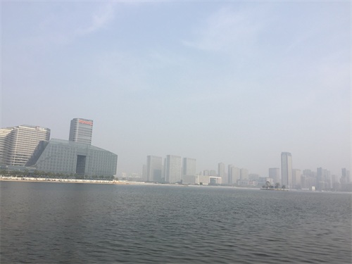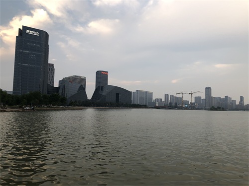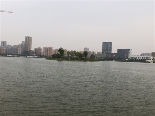 从1号线下沙西地铁站D出口,一眼就可以看到前往金沙湖的路口,一进入金沙湖公园不久,就可以看到美丽的湖面,清澈的湖水,倒映的高楼,一座小岛耸立在湖中央。