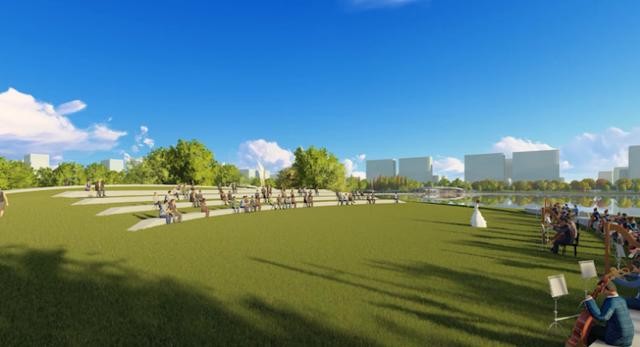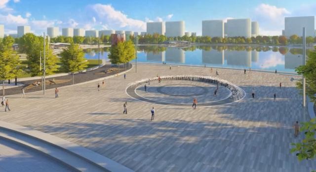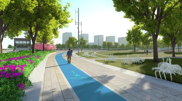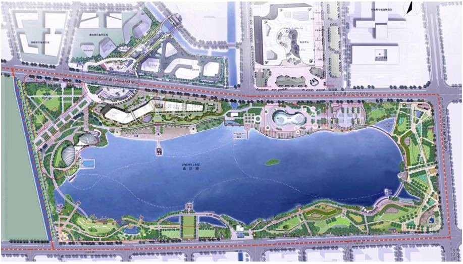 此外金沙湖公园正在打造湖面与湖区周边的绿化工程,一条长约3.2公里的环湖跑道将串起文化艺术广场、音乐喷泉、庆典广场、樱花大道等功能及景观节点,方便市民赏湖、散步、慢跑等。文化艺术广场以“弄潮、踏浪”为主题,设置了月牙形音乐喷泉,与钱塘江潮同律动。露天演绎区将结合台阶式草坪空间及电子屏形成立体交互式户外表演空间。庆典广场赋予主题性开放空间,以大草坪、特色樱花大道、特色景观灯、四季宿根花海为主景调,为室外艺术展览、花卉艺术节等提供场地。