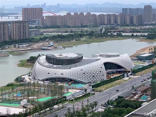公园内正在建设中的金沙大剧院总建筑面积4.4万平方米、拥有两大功能区域、1365座剧院厅和500座多功能厅,金沙湖大剧院的建成,将不仅是秀美湖畔的点睛之笔,更是钱塘区文化项目建设的新地标, 银白色盛装,向市民传达着文化与艺术意蕴,丰富市民的文化生活。