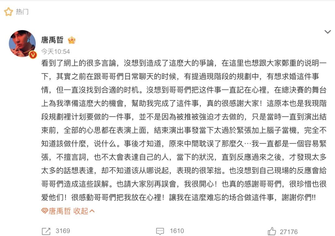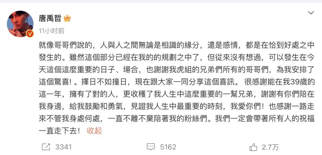 11月6日凌晨,唐禹哲发文回复网友关于被强迫求婚的争议。本人表示:结婚虽然已经是在自己的规划之中,但是没有想到能在这个重要的场合进行,既然是哥哥们帮他安排了这个惊喜,那就择日不如撞日。