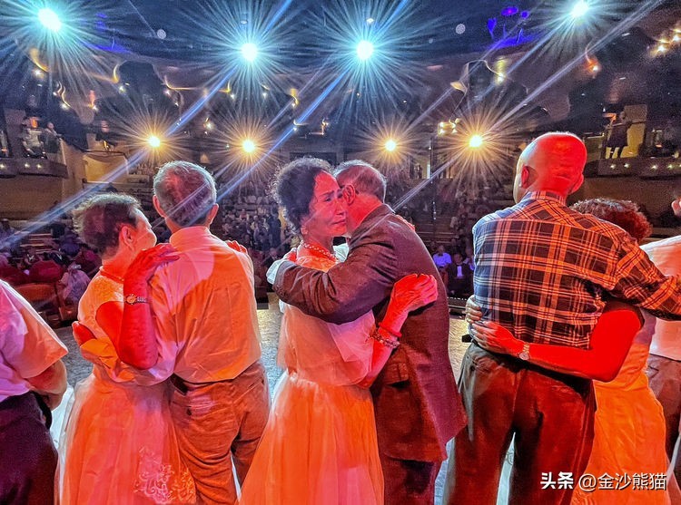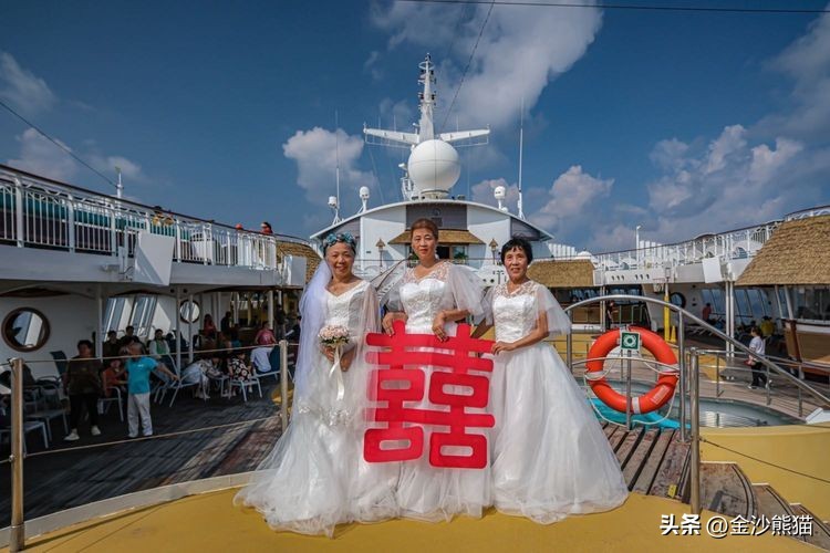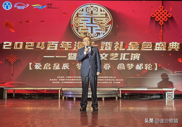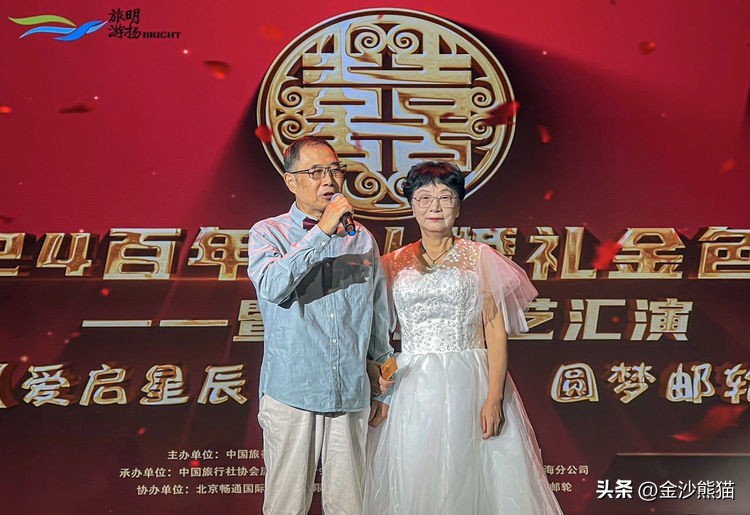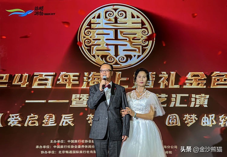 来自中国北京、四川、广西、河南、宁夏等地的1550名嘉宾、中老年文艺团队和游客朋友们,参与了此次盛典。其中60多名中老年朋友身穿华丽的婚纱礼服,手牵手步入《2024百年海上婚礼金色盛典》的会场,参与这场专为爱情加冕的盛宴。