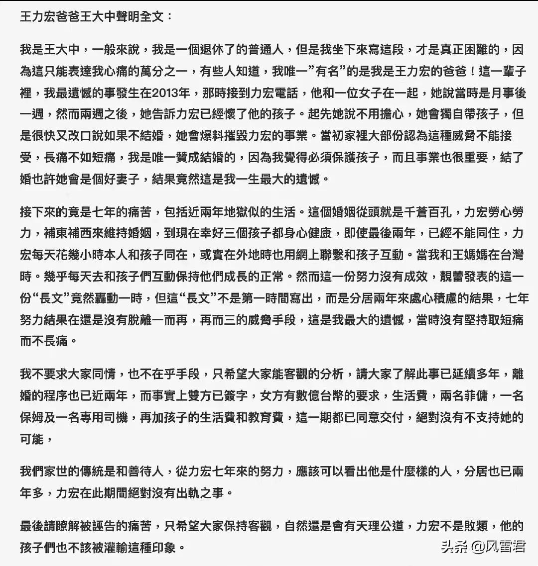 意外的是,本来是两口子的事情,王力宏躲着不出声,倒是王力宏的爸爸王大中出手了。