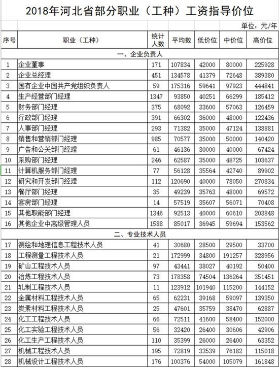 日前,河北省人社厅发布了2018年河北省部分职业(工种)工资指导价位。本次发布的工资指导价位共涉及363个职业(工种)、18个行业门类,基本覆盖了河北省通用的职位(工种),包括高、中、低和平均4个价位。
