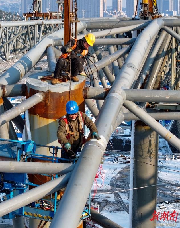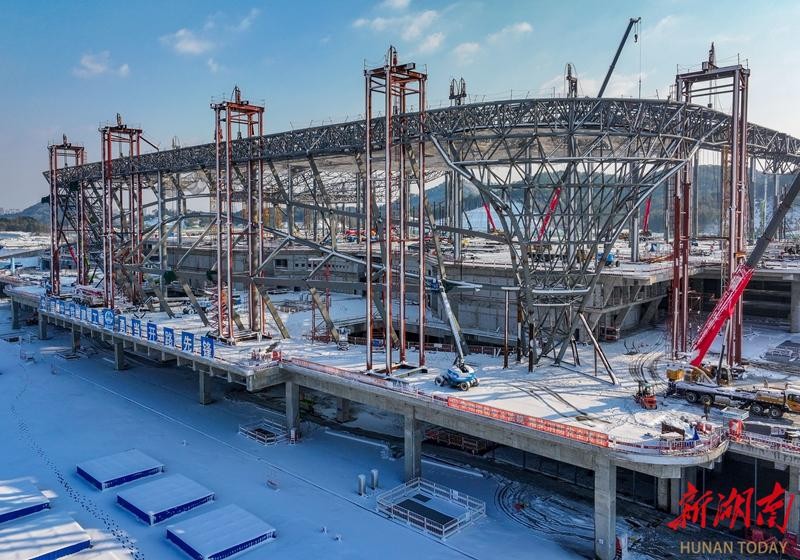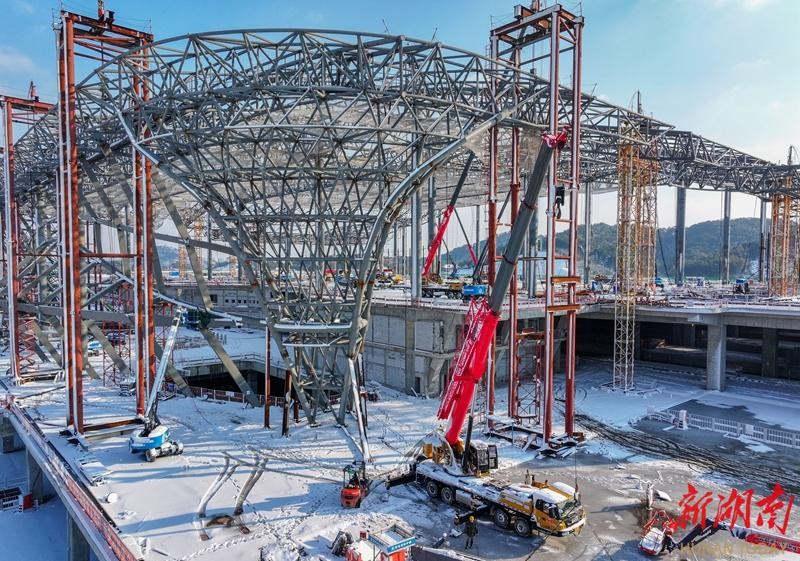 湖南日报·新湖南客户端1月25日讯(记者王晗)今天,位于湖南湘江新区的长沙高铁西站交通枢纽工程(以下简称“长沙高铁西站”)建设现场机器轰鸣,施工人员冒着严寒在钢结构屋盖上紧张施工。目前,站房中区钢结构屋盖顺利完成提升,已全面进入金属屋面施工阶段。