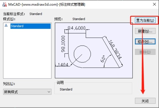 7.回到“标注样式管理器”点击置为当前再点击关闭
