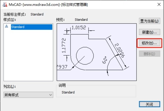 2.在标注样式管理器上面选择当前样式在点击“修改”