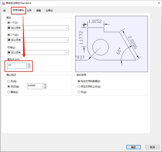 4.我们点击“符号和箭头”这一栏将箭头修改为10(这里这个数值根据图形的大小来调整)