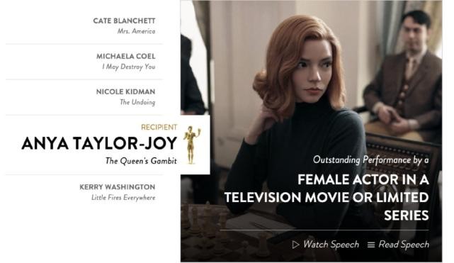 4月5日,安雅·泰勒·乔伊凭借电视剧《后翼弃兵》再次拿下大奖,获得了第27届演员工会奖迷你剧的最佳女主角。