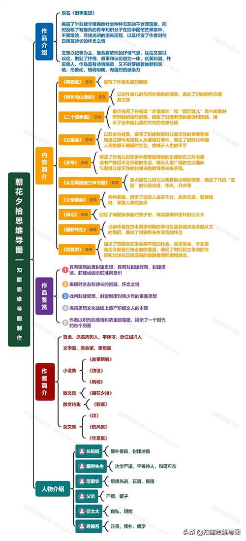 《朝花夕拾》的思维导图你会画吗?鲁迅先生的文章相必很多人都读过,特别是像《阿长与山海经》与《三味书屋》是令人记忆最为深刻的两篇,此外还有孔乙己、祥林嫂、阿Q等人物更是让人感叹旧社会对人性的摧残,也让我们对现在的自由美好生活更加珍惜。《朝花夕拾》是鲁迅先生的回忆性散文集,下面就让我们通过朝花夕拾的思维导图一起来了解一下鲁迅先生想要表达的内容。